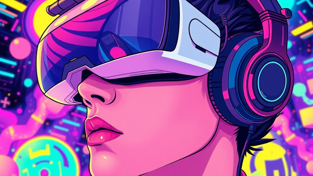 A vibrant and surreal close-up of an individual immersed in technology, wearing a sleek VR headset and headphones, illustrated in the style of Victor Mosquera. The image embodies neo-dada elements with a vaporwave twist, blending cartoon-like features with hyperrealistic details. The scene bursts with vivid colors and futuristic patterns, capturing the essence of a digital dreamscape. The art is rendered in vector style, emphasizing bold lines and dynamic compositions, creating an otherworldly yet familiar vision of virtual reality.
