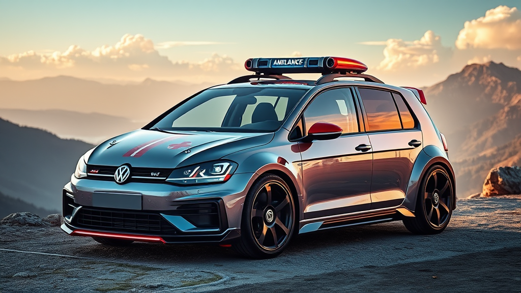 A futuristic VW Golf car transformed into a robotic marvel with an ambulance symbol, set against a breathtaking mountainous landscape. The scene is infused with neon accents and bathed in the golden glow of sunlight, creating a panoramic view. The car's metallic surface glistens with intricate detailing, capturing the essence of advanced engineering, rendered in stunning high resolution at 8k for an immersive experience.