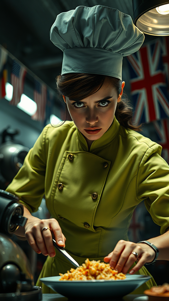 In a bustling restaurant kitchen set in a futuristic dieselpunk world, an aggressive female chef wearing an intricately detailed formal Chartreuse Earthy green uniform commands attention. The fabric of her uniform reveals realistic textures and folds under dramatic cinematic lighting. Captured from a low angle shot, she assumes a dynamic action posture that conveys intensity and skill. Her face is rendered with the highest level of detail, showcasing wide-open eyes, a raised eyebrow, and an angry expression as she prepares food with frenzied precision. The scene exudes a sense of urgency and energy, despite a monotonous and uninspired background characterized by low contrast and background noise. A futuristic helmet with hard surfaces sits by her workstation, and flags like the stars and stripes and Union Jack hang subtly among kitchen tools. This masterpiece is captured in 8k resolution, highlighting every nuance in a dark, cinematic atmosphere. The chefs' powerful presence overshadows the simple backdrop, where the mundane task of preparing food seems oddly out of place in this sci-fi mise-en-scène.