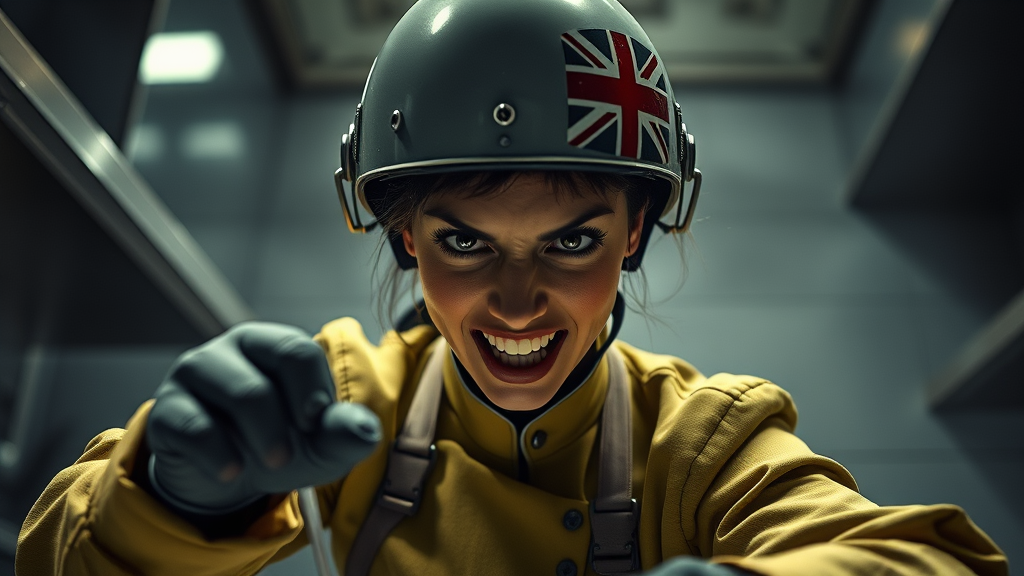 A dynamic scene depicting an aggressive female cook in an intricate, highly detailed formal Chartreuse earthy green cloth uniform, set in a sci-fi futuristic Dieselpunk universe. Captured in dramatic cinematic lighting from a low angle, she strikes a dynamic action pose with the kitchen as her battleground. Her face is a masterpiece of expression, showcasing wide-open eyes and a raised eyebrow in an angry, frenzied glare, emphasizing her distaste for the mundane task of preparing boring food. The image is in stunning 8k resolution, with dark, realistic fabric details and folds. The simple monochrome background offers low contrast, adding to the chaotic background noise. She dons a hard-surfaced helmet featuring combined elements of stars and stripes with a union jack. The scene exudes intensity and power without crossing into NSFW territory, focusing on her commanding presence rather than gratuitous elements, all while maintaining the spirit of creativity and innovation against a backdrop of mundane cooking challenges.