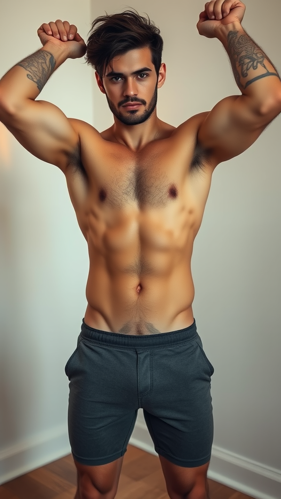 A captivating Italian man with tousled dark hair and a strikingly hairy chest stands confidently, his arms raised to reveal natural underarm hair. His toned abs and fit physique are accentuated by tight charcoal gray shorts. Tattoos decorate his robust arms, each design telling its own story. He is posed in a minimalistic room with pristine white walls, the simplicity highlighting his presence. The warm, amber glow of the golden hour illuminates his form, casting soft shadows that play across his body. This full-body shot captures a raw and authentic moment, reminiscent of a snapshot shared on social media in the late 2010s.
