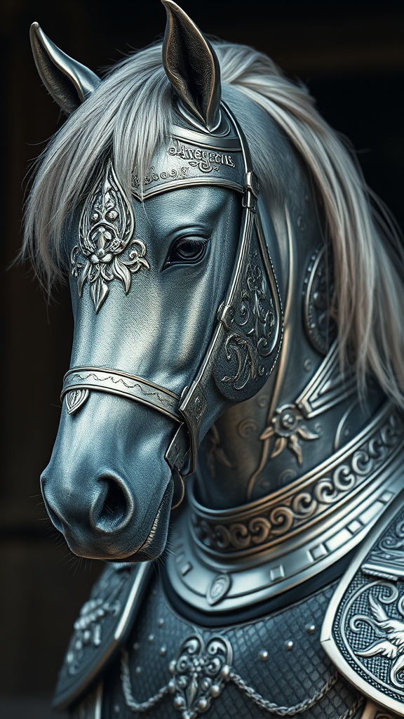 Intricate portrait of a dangerhorse adorned in finely detailed silver armor featuring intricate designs and silky accents, captured with cinematic lighting in stunning 4k resolution, subtle creative adjustments evoke a sense of power and elegance.