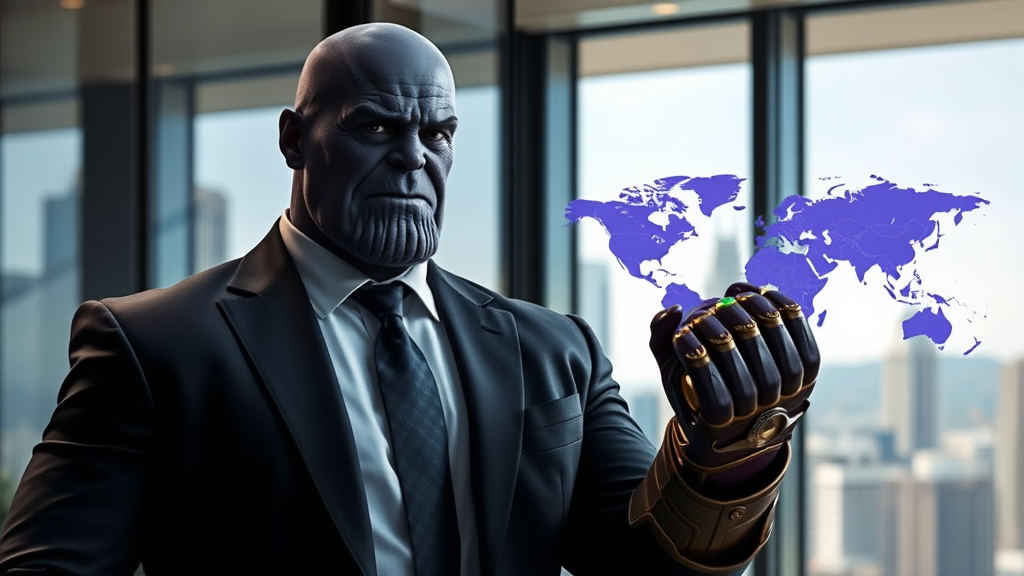 Thanos, a formidable businessman, stands in his sleek office, the city skyline visible through the floor-to-ceiling windows behind him. His commanding presence fills the room, a tailored suit hugging his powerful frame, while dramatic lighting casts deep shadows on his chiseled features. The Infinity Gauntlet remains a symbol of his strategic mind, each gem representing a market he dominates. His eyes, set with steely determination, focus on a world map dotted with his corporate conquests, embodying his relentless pursuit of balance in the business world.