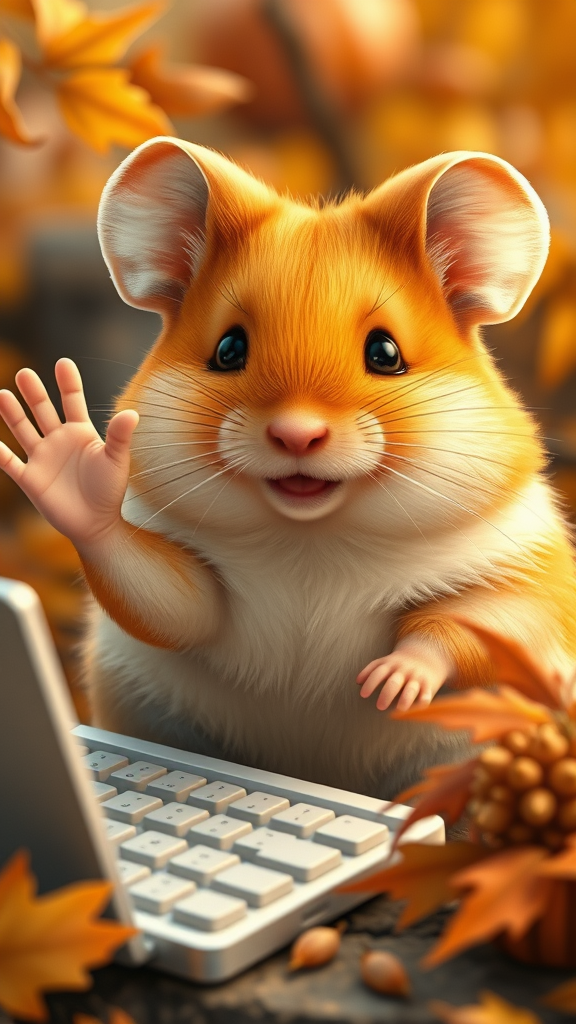 A captivating portrait of an irresistibly cute and charming golden hamster, cheerfully waving farewell while intently typing a blog post. The design embodies the whimsical spirit of Mark Ryden, Pixar, and Hayao Miyazaki, showcasing a flawlessly smooth face and endearing features. Set in a vibrant harvest fall atmosphere, the scene is rich with intricate details and infused with cinematic lighting. The composition is hyperrealistic, reminiscent of diorama macro photography, captured in stunning 8k and 4k resolution.
