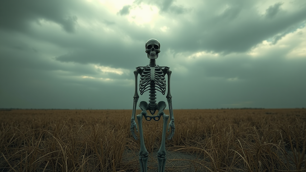 A haunting skeleton with an unsettling presence stands alone in a desolate field under an ominous sky, evoking a sense of eerie beauty; a character portrait reminiscent of Mike Winkelmann's surreal style, exuding the mastery of a CGSociety contest winner, blending elements of environmental art with hyper-detailed textures. The scene is enhanced with cinematic effects that bring the haunting landscape to life, harnessing the power of Unreal Engine 5 and CryEngine to create a chilling yet mesmerizing visual masterpiece, capturing a uniquely eerie atmosphere perfect for #vfxfriday.