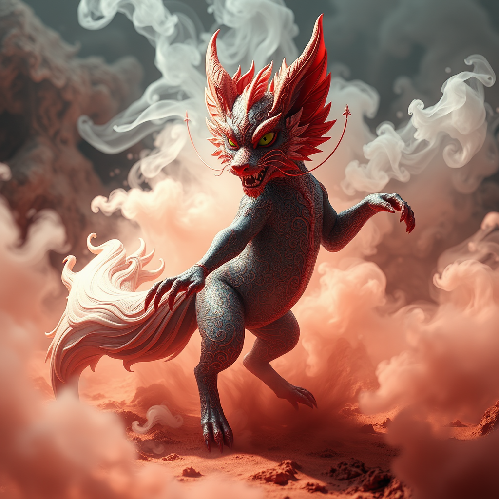 A vividly detailed mythical fox demon, featuring ornate and intricate designs, dances through a psychedelic landscape with turbulent fluid dynamics and fractal-like details. Its form is enveloped in smokey, symmetrical patterns, captured in sharp focus with vibrant colors. Volumetric fog swirls around, set under precise studio lighting that accentuates the scene. The depth of field draws the eye to the fox demon, bringing an otherworldly dimension to life using the Unreal Engine and Octane Render, enhanced by raytracing for a stunning visual effect.