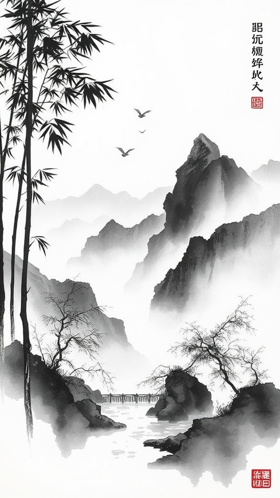 Black ink landscape painting, delicate brush strokes capture the essence of nature with serene mountains and gentle streams, tall bamboo swaying gracefully, mist envelops the scene adding depth and mystery, harmonious balance between emptiness and detail, evokes calm and introspection, a tribute to traditional Japanese suibokuga art, emphasizing simplicity and elegance, enhanced by subtle modern touches, creating an emotive visual experience at an ethereal scale.