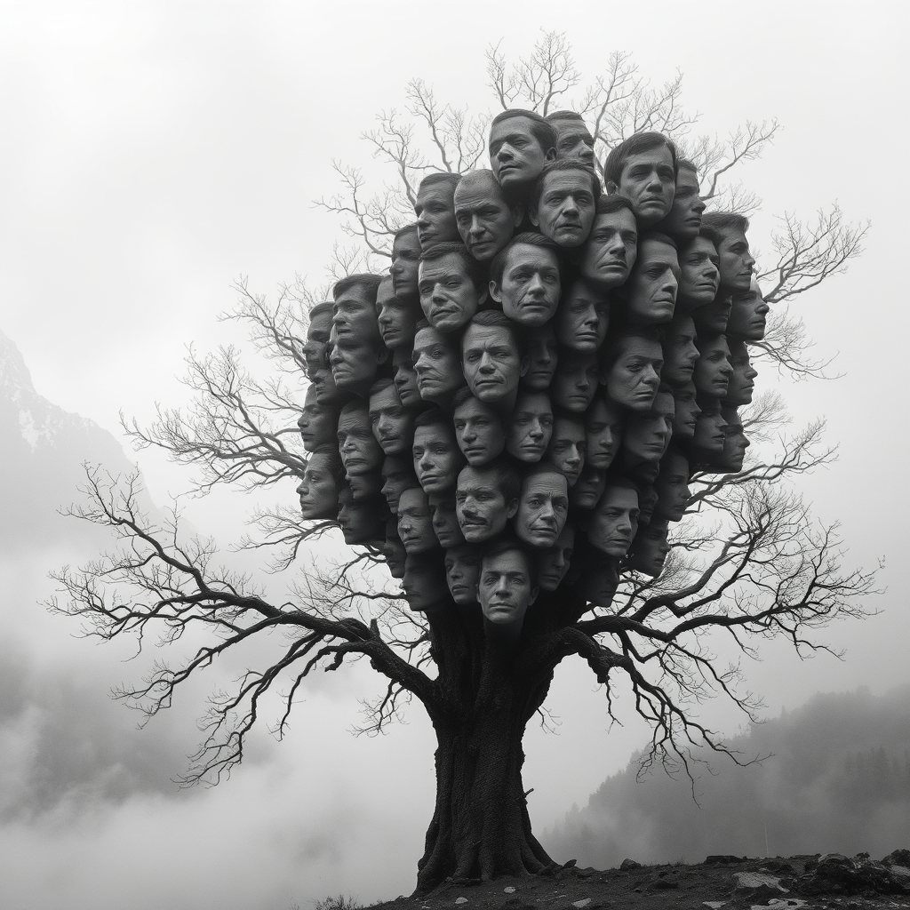 A surreal tree composed of numerous interwoven human faces, set against a fog-shrouded mountainous backdrop, capturing a mysterious and ethereal landscape in grayscale. The scene evokes a sense of dark surrealism through cinematic hyper-realistic photography, with intricate facial details emerging from the bark and branches, blending seamlessly into the misty atmosphere of the mountains.