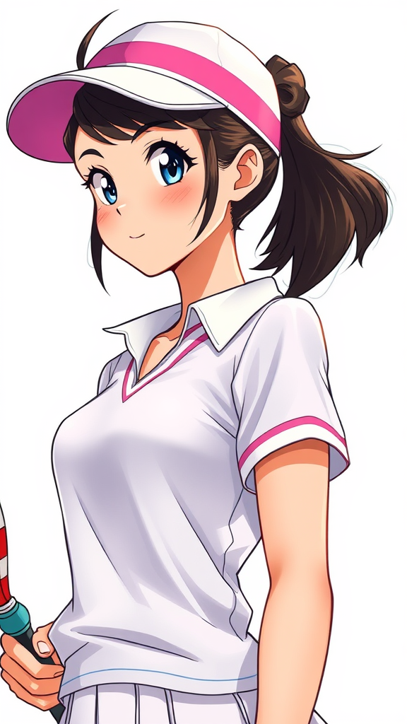 A detailed illustration of a young woman wearing a vintage-style tennis uniform, complete with a tennis racket in hand, reminiscent of Misty from Pokemon. She embodies the art style of 1980s anime with vibrant colors and bold lines, capturing the essence of retro anime with a hint of 1990s anime influences. Her expression is spirited and confident, with a realistic 3D anime twist. Her hairstyle is reminiscent of classic anime icons, and the background features subtle pastel tones, evoking a nostalgic yet dynamic scene.