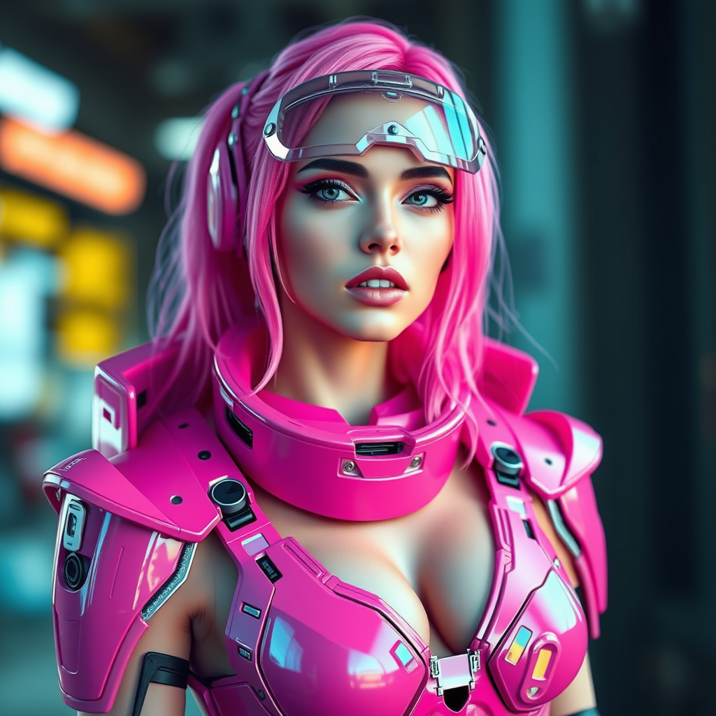 Gorgeous female cyborg in pink futuristic combat armor, with vibrant pink hair and a touch of cyberpunk flair, dressed in sleek high-tech lingerie. Her look is both flirtatious and alluring, captured in a detailed and realistic portrait. The image features a full-length view with an emphasis on intricate skin detail and a focus on hyperrealism, rendered in 8k quality with diffused soft lighting to create a shallow depth of field. The cinematic lighting and sharp focus enhance her hi-tech sci-fi aesthetic. In the composition, avoid low resolution, text errors, and artifacts, ensuring a natural and proportional anatomy with no awkward or extraneous features. Keep the image free from distortions, such as fused fingers or incorrect limb proportions, and maintain a clear, polished, and sophisticated finish.