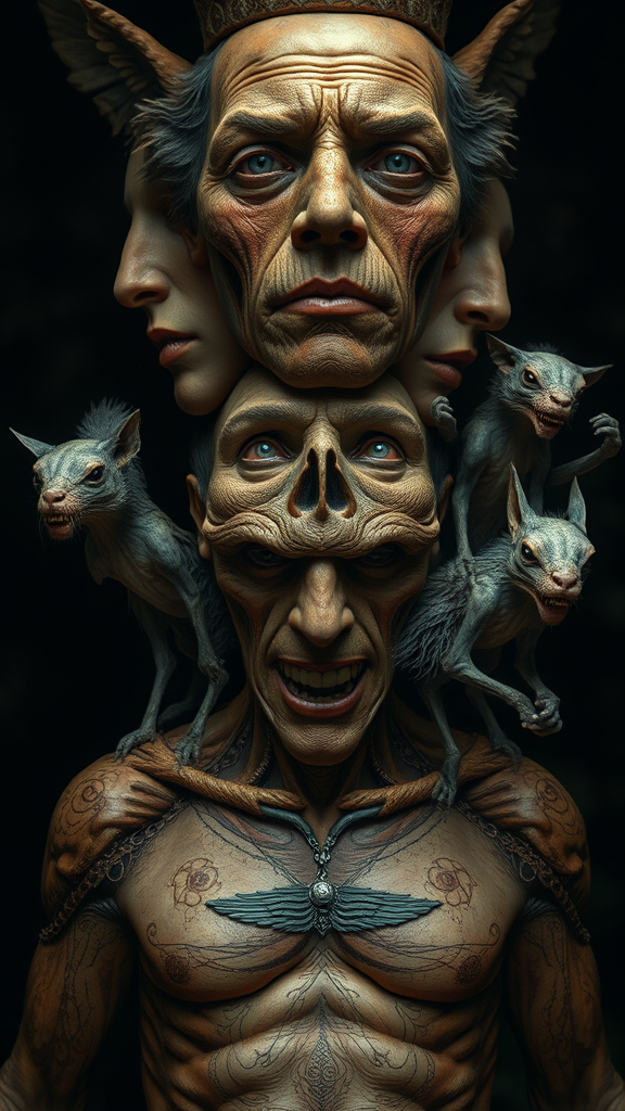 Absurdly detailed faces, cinematic painting with intricate detail, dim natural lighting, animals in HDR, stacked torsos resembling a totem pole, elements of poor anatomy, with extra, missing or floating limbs, disjointed and mutated figures, creating an unsettling, distorted image reminiscent of a surreal dreamscape, combining beauty and grotesqueness in a blurry, abstract composition.