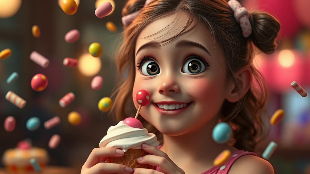 A charming, joyful girl with bright eyes enjoying her ice cream, surrounded by colorful candies swirling in the air. The scene has a Pixar-like, cinematic quality with enchanting lighting that captures the whimsical, magical aura. The atmosphere blends elements of a Disney fantasy with a touch of gaming adventure, rendered in stunning 8k detail. The essence of love and wonder fills the air.