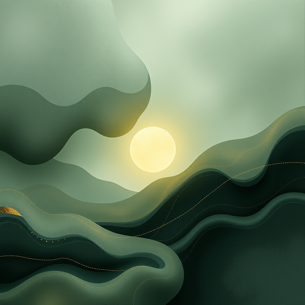 An enchanting album cover featuring a serene, abstract landscape with soft, flowing textures that meld seamlessly into one another, evoking a sense of tranquility. Earthy tones of deep greens and gentle blues are interwoven with hints of muted gold to create a raw, organic feel. The centerpiece is a subtle, glowing orb that casts a calming light across the scene, adding an ethereal touch. The overall composition exudes a harmonious balance between nature and dreamlike elements, inviting the viewer to pause and breathe in the serenity.