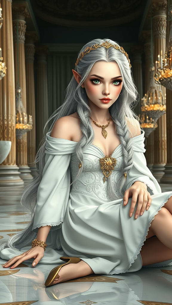 flowing half-tied braid of long silver hair, detailed face and eyes, photorealistic, hyperrealism, elven tiara circlet bracelet amulet, green eyes, intricate off-shoulder white dress long sleeve, white cloak, slender fingers, pale luminous skin, graceful waist, detailed intricate gold vine circlet, shapely legs, elegant heels, reclining on a marble floor, ornate chandeliers, grand hall with towering columns, masterpiece, illustration, 3D rendering, artwork, a blend of realistic painting and fantasy elements, avoiding low resolution, maintaining realistic anatomy and proportions, full-body shot including upper body.