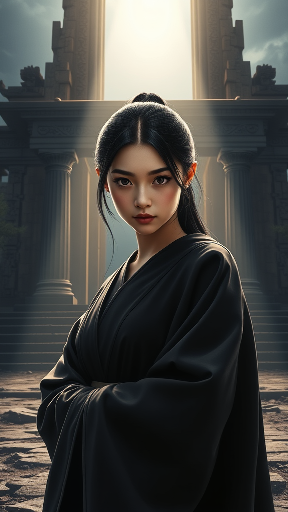A young woman in dark robes stands in front of an ancient temple under dramatic lighting, her symmetrical eyes piercing and expressive. The scene is captured with sharp focus in HD quality, showcasing highly complex and intricate details. The hyperrealistic photography employs advanced raytracing and physics-based rendering techniques. She strikes a dynamic pose, exuding a blend of realism and fantastical elements. The overall aesthetic blends CGI, 3D elements, and anime influences, resulting in a digital painting that is both an illustration and a masterful example of digital art.