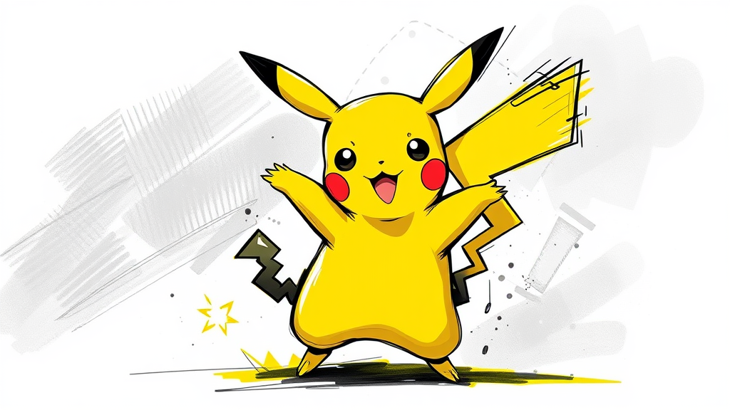 Pokemon Pikachu striking an energetic pose, anime-style sketch infused with nvinkpunk elements, blending abstract brush strokes and bold lines, HDR Neo-Noir ambiance with vibrant neon yellow highlights, refined minimalism in design and composition.