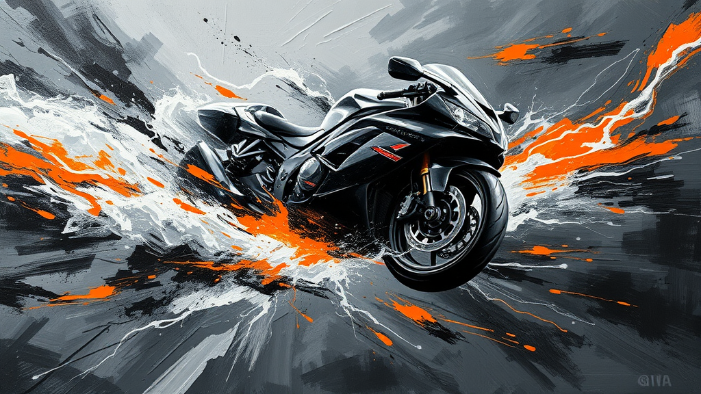 A dynamic masterpiece capturing the essence of speed and electricity, rendered using the impasto technique in oil, embodying the vibrancy of contemporary art. The canvas is dominated by a primarily monochromatic palette, where deep shades of black and gray flow together, interrupted by striking accents of vivid orange and crisp white that add energy and contrast, sculpting the subject with rich textures and bold brushstrokes.