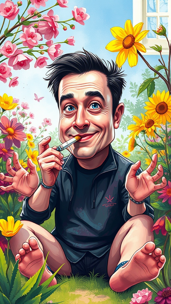 A humorous and highly detailed illustration depicts a caricature of Elon Musk smoking a blunt in his garden during springtime. The scene is vibrant and colorful, with bright and saturated hues that create a lively and energetic atmosphere. Elon makes direct eye contact with a playful expression, adding to the comedic effect. The artwork features a creative blend of digital techniques, including splashes of paint, ink details, and fine art pencil strokes. Despite its artistic finesse, the illustration includes intentionally exaggerated elements like poorly drawn hands and feet, an awkwardly rendered face, and extra limbs, contributing to a whimsical, disfigured appearance. Parts of the body appear out of frame, with a blurred and grainy texture adding to the quirky charm. There are amusing imperfections such as bad anatomy, blurred details, a casual watermark, and a draft-like signature that enhance the humorous nature of the piece. The whole image is centered in the frame, capturing the delightful essence of a spring day in a garden, with an underlying sense of playfulness and creative chaos.