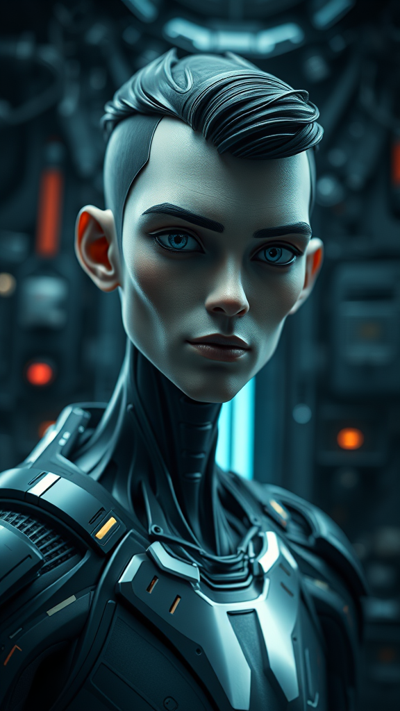 A hyper-realistic sci-fi scene with exceptional depth of field, featuring a sharp focus on a futuristic character with cinematic lighting against a complex backdrop. The image boasts perfect composition in 8k UHD and HDR quality, capturing the essence of advanced technology and imagination. The character, based on the Model: ReV Animated v1.21, is a striking figure with unique features, including a slightly elongated neck and distinct facial expressions. The scene exudes an air of mystery, with subtle, intentional imperfections that add to its authenticity. Notably absent are any distracting low-resolution elements, such as out-of-frame objects, blurriness, jpeg artifacts, watermarks, logos, or text overlays, ensuring a pristine, immersive visual experience without cartoonish or fragmented depictions.