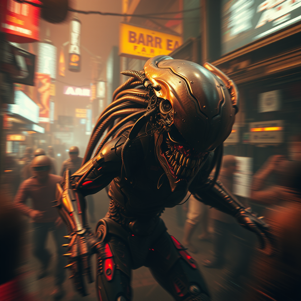 Cinematic film still, ultra detailed and realistic, capturing a cyber predator in the year 2099, featuring intricate details amidst a chaotic and gritty backdrop. The scene is surreal, with elements of distortion and abstraction, presenting a world that is both hyper-real and dreamlike. The environment is filled with a cacophony of noise, featuring blurred and dynamic motion, embracing a gritty, grainy aesthetic. The cyber predator has a twisted, mutated appearance, evoking both fear and awe, with exaggerated features and a complex design. The color palette is vivid yet slightly oversaturated, highlighting the stark contrast between technologically advanced elements and a decaying urban landscape. Soft shadows and dramatic lighting create a sense of depth and movement, while hints of impressionistic brushstrokes and glitch-like effects lend it an artistic, avant-garde quality. The overall composition conveys a sense of urgency and tension, a visual symphony that blurs the line between reality and abstraction.
