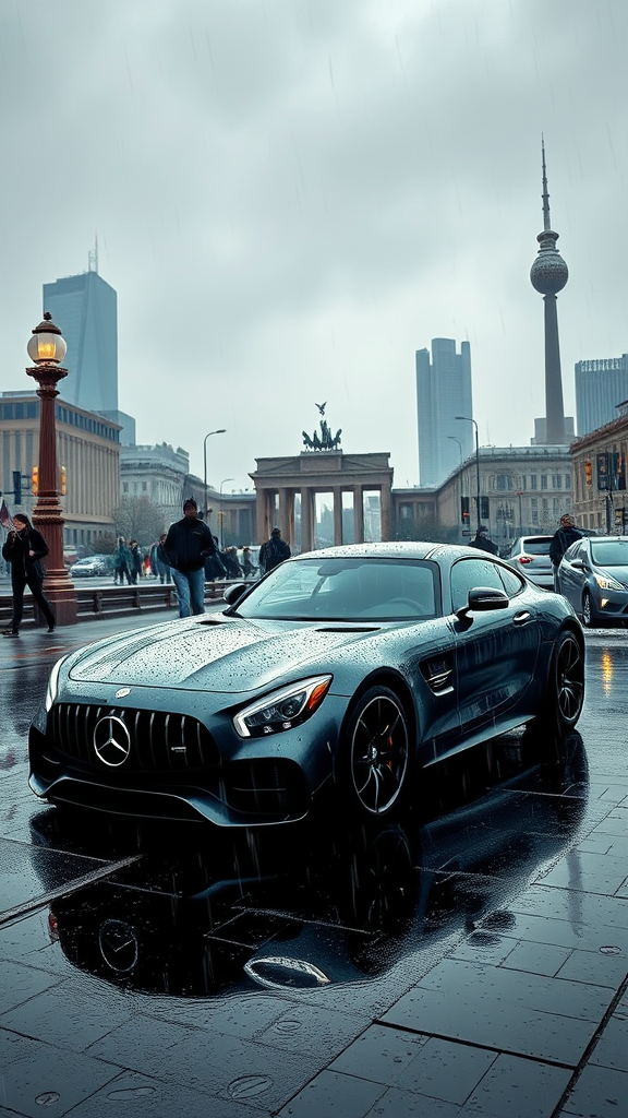 A highly realistic illustration of a sleek Black Mercedes Benz AMG GTR elegantly parked against the backdrop of Berlin, Germany. The scene is set at midday, with rain softly falling, creating shimmering reflections on the wet pavement. The iconic landmarks blend seamlessly into the misty urban landscape, infusing the atmosphere with a sense of dynamic motion. Ultra detailed textures and vibrant colors bring the car and surroundings to life, capturing the essence of the moment in 8K resolution with HDR effects, reminiscent of an Octane Render. Additional elements like subtly blurred pedestrians with umbrellas and the soft glow of traffic lights enhance the scene’s authenticity.