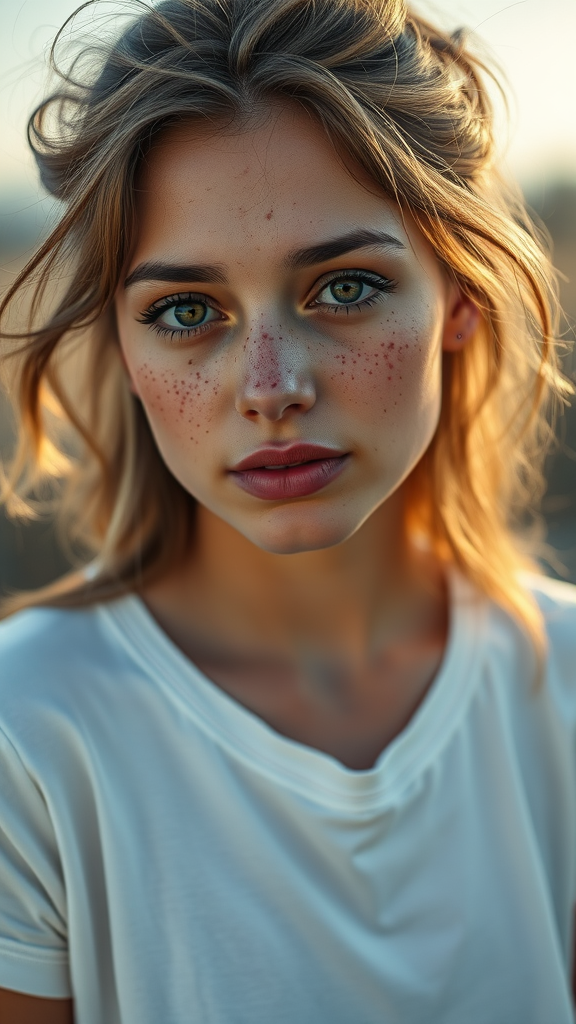 Detailed and realistic portrait of a woman with freckles, bright round eyes and slightly tousled hair, captured outdoors, donning a simple white t-shirt, showcasing natural skin texture with slightly chapped lips, using gentle and soft lighting for a serene ambiance. Shot with an 85mm lens for that magical and photo-realistic quality, employing dramatic yet natural lighting. Ultra-detailed with a cinematic touch, inspired by Cinestill 800T film aesthetics, evoking a relaxed and authentic vibe.