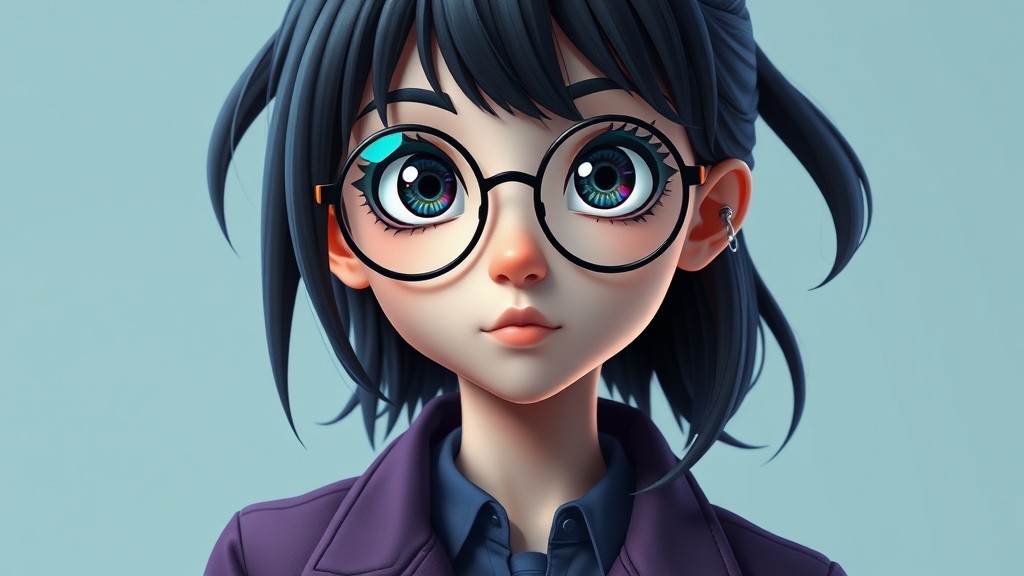 3D render portrait of an anime girl character with round glasses, hyper-realistic, wearing a dark purple lab coat. The art style is inspired by Pixar and Disney, featuring an 8k resolution canvas frame. The character is depicted in a cartoonish 3D style, with vibrant and unusual colors. Despite the creative design, there's a slightly surreal touch with some exaggerated features like extra fingers, extra limbs, and odd proportions, creating an intentionally quirky and imaginative look. The character's face is expressive, though slightly out of traditional frame, adding a dynamic feel. Incorporating elements from video games and Photoshop, the artwork combines a playful yet distorted visual, emphasizing an unconventional artistic approach.