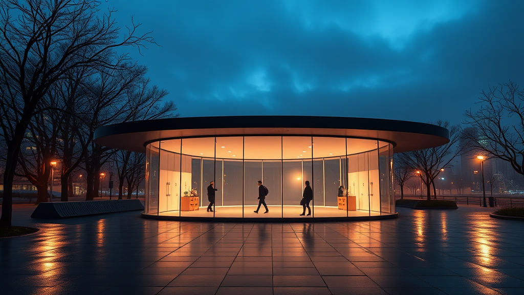 Capture a minimalist architectural marvel, a contemporary pavilion with an elegant symmetrical curved design, offering a breathtaking panoramic view. Imagine this scene captured through architectural photography at night, using a Canon EOS R5 with a setting of f/2.8, enhanced by a long exposure on a tripod. Picture a pavilion with illuminated curved glass, its translucent walls formed by seamless panels, all supported by a matte black steel roof. Set in a tranquil urban park, the environment is accented by bare winter trees and a wet, reflective pavement. Envision a twilight atmosphere filled with a misty, dramatic ambiance, and the warmth of interior lighting mingling with ambient city lights. See the condensation clinging to glass surfaces, silhouetted figures moving within, all rendered in ultra-realistic detail. This architectural visualization captures rich details and embodies a contemporary aesthetic.