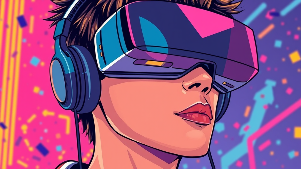 A hyperreal image of a person wearing a sleek VR headset and stylish headphones, featuring vivid colors in a vaporwave cartoon style, reminiscent of Victor Mosquera's neo-dada influence. The close-up highlights intricate details of the headset with a futuristic design, set against a dynamic backdrop of abstract digital elements. The composition is rendered in crisp vector art, with an emphasis on the interplay of light and shadow to enhance the immersive experience, creating a visually striking and imaginative scene.