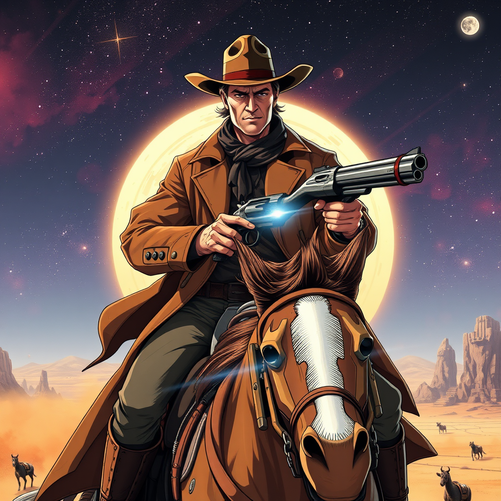 John Wayne as a futuristic anime space cowboy, blending rugged western style with sleek sci-fi elements, reminiscent of Cowboy Bebop and Trigun; set in a sprawling galaxy where dusty frontier planets meet high-tech civilizations, featuring a stoic gunslinger with a trusty laser revolver and a weathered duster coat, riding a hover steed across starry vistas, amidst neon-lit cantinas and asteroid mining towns.