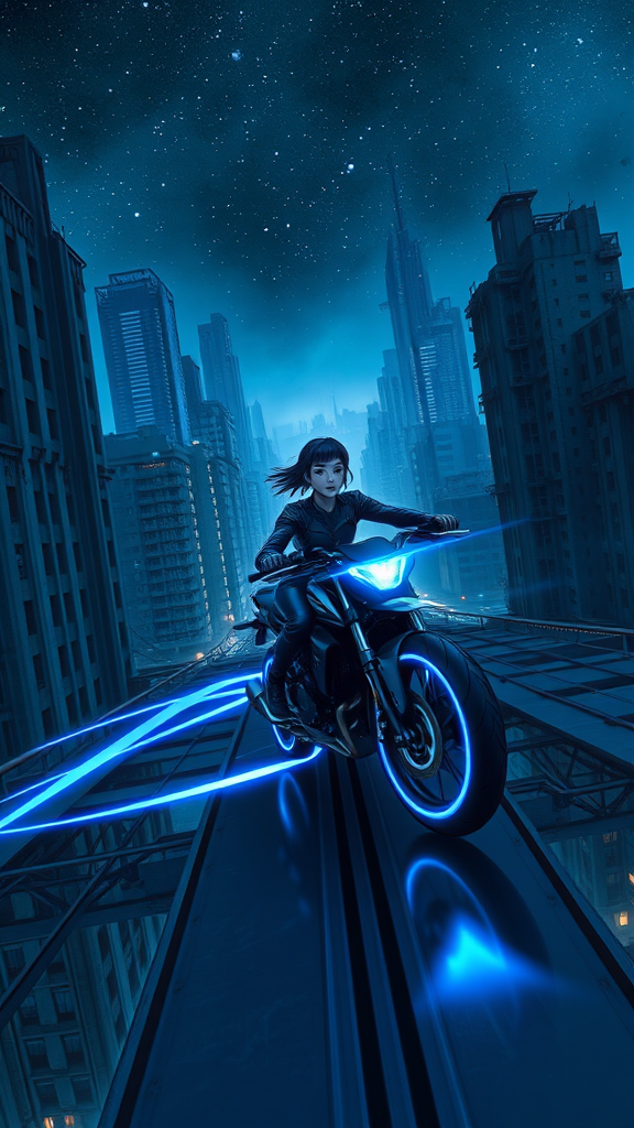 A young woman in a sleek sci-fi jumpsuit races across a futuristic motorcycle on a towering bridge, set against the backdrop of a desolate sci-fi metropolis with towering, dilapidated skyscrapers. The scene evokes the atmosphere of Akira and Tsutomu Nihei's work, particularly from ABARA, emphasizing gigantism and multistoried spaces. The futuristic landscape is characterized by a stark, dark ambience, highlighted by the neon glow of the motorcycle beneath a starry night. Her motorbike radiates vivid blue neon lights, casting dynamic blue energy trails as she speeds through the dystopian setting. The artwork is in the style of manga graphics, featuring a dark exposure with intricate details rendered in Full-HD and 8K resolution. The first-person perspective enhances the immersive experience, with an overarching palette dominated by a range of blue tones, capturing the essence of high-quality, detailed anime drawing.