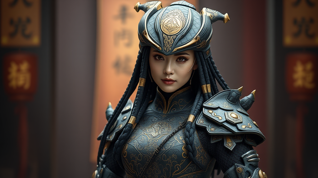 A woman in intricate predator-inspired cosplay, exhibiting ultra-detail in the style of Unreal Engine 5, infused with Ming Dynasty elegance. Her costume features a dark gray and gold palette with blink-and-you-miss-it details, incorporating anime aesthetic nuances. Her stylish design radiates an ancient yet futuristic allure, blending historical and sci-fi elements seamlessly.