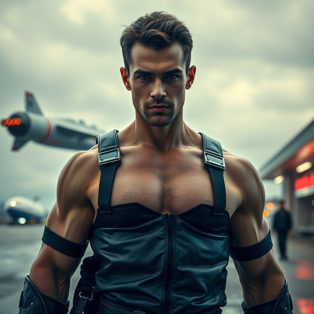 Ultrarealistic portrait photograph featuring a full-body image of a 28-year-old Israeli Caucasian male, showcasing his dominant and confident stance. The scene is captured with a wide field of view to encompass his muscular and perfectly toned physique, with notable features like a hairy chest and shiny hair. Shot using a Hasselblad X1D - 50c camera, the image embraces cinematic and moody lighting effects, along with subtle blur and long exposure to create an 8K Ultra-HD hyper-realistic aesthetic. The setting is a futuristic spaceport, where he stands in an action pose against the backdrop of a sci-fi ship taking off in an overcast sky. He is clad in detailed, plate leather armor, with natural textures emphasized through volumetric and natural lighting. The image, inspired by the style of 'pursuit' by Gesaffelstein, captures the essence of a cinematic, vibrant, and detailed scene, focusing on photorealism with no signs of digital artifacts, maintaining perfect anatomy, and preserving all natural elements in a high-quality, high-detail portrayal.