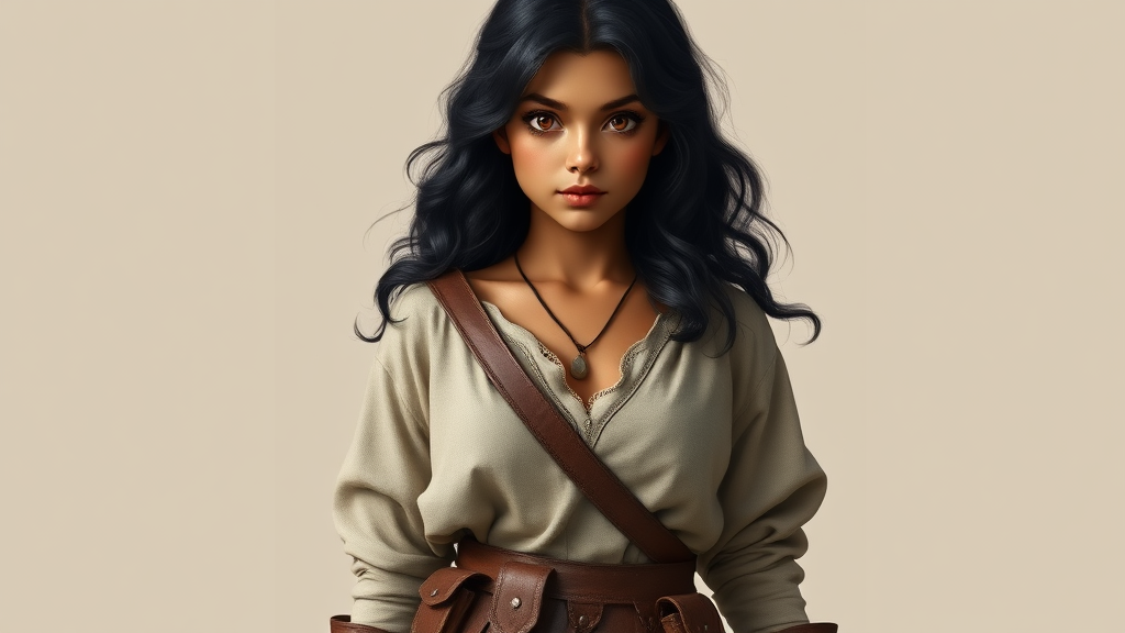 Portrait of a charming young female adventurer with wavy black hair and a dark tan complexion, possessing large, expressive brown eyes that convey friendliness and intelligence. She stands confidently, adorned in a long, loose fantasy tunic and cloth tights, complemented by leather armor. A thick leather belt, equipped with various pouches, encircles her waist, highlighting her wide hips. The scene captures the essence of a fantasy genre in ultra-high definition and high dynamic range. The adventurer exudes an aura of both strength and approachability.