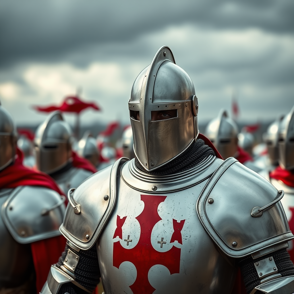 Photorealistic image of a Templar knight's armor and helmet, gleaming white with a vibrant red cross on the chestplate, standing resolute in formation among fellow knights, poised for battle. The scene is set against an expansive battlefield, with a somber grey sky looming overhead. The focus is sharp and intimate courtesy of the 50mm lens, highlighting the intricate details of the armor. A subtle blur adds depth, capturing the tension and anticipation in the knights' stances, with wind softly rustling their crimson tunics for an added dynamic touch.