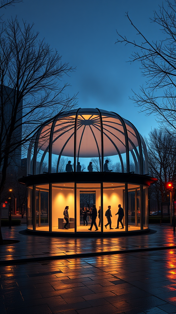 Minimalist architectural marvel featuring a contemporary pavilion design with a symmetrical curved structure offering a panoramic view. Captured in architectural photography, the scene unfolds at night using a Canon EOS R5, f/2.8, long exposure, with the camera tripod mounted. The illuminated pavilion boasts translucent curved glass walls and seamless glass panels, complemented by a matte black steel frame roof. Set in an urban park, the atmosphere is enhanced by bare winter trees and wet reflective pavement, adding to the twilight mood with a misty, dramatic evening ambiance. Warm interior lighting contrasts with ambient city lights, while condensation forms on the glass surface, and silhouettes of people move gracefully inside. The visualization is ultra-realistic, rich in detail, maintaining the essence of the original concept.