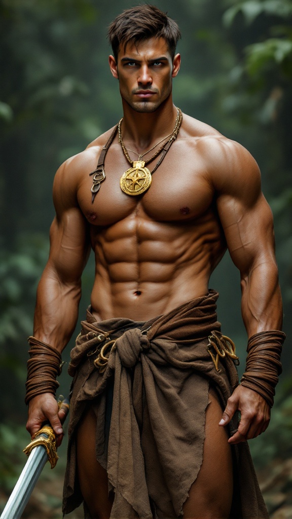 hypermasculine male, manly. Caucasian jungle man, dark brown hair short on sides longer on top. A brown leather band tied around the forehead. Tanned skin, smooth and hairless. Pale grey eyes with intense spiritual gaze. Strong brow and chiseled strong jaw, handsome, rugged looks. Tall, strong, muscular, sinewy, well defined, broad shoulders, broad chest, wide back. Olympian gymnast build/body. Gold necklace/talisman with leather strap around the neck. Wrapped brown leather bands around wrists, bands around tops of biceps, accenting big arms. Brown o-ring harness on the chest, strapped from the shoulder. Brown leather loincloth, barely covering the crotch area, exposing strong powerful legs. Soft, brown cloth knee-high boots wrapped around legs. Full body pose. He wields a unique bastard sword that he straps to his back. He keeps company with a huge, sleek black panther. ((MASTERPIECE))