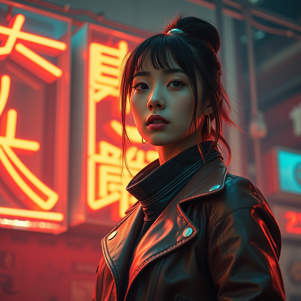 A hyper-realistic sci-fi scene featuring a woman in front of a glowing neon sign, showcasing a fusion of steelpunk aesthetics and candid portraiture typically reserved for famous figures. The setting is infused with an intriguing mote kei vibe, highlighting elements of leather and hide that accentuate her attire. The ambiance could easily fit within the pages of a DC Comics universe, captured with the sharp elegance of a Sony Alpha A1. The composition strikes an ethereal balance between the futuristic and the tactile, capturing the essence of a vibrant 77:100 aspect ratio with a dynamic sensitivity akin to 750 -- akin to the transformative energy of niji 5.