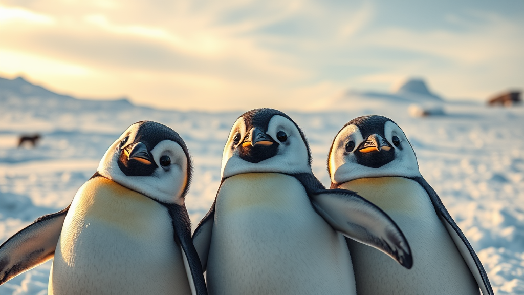 Three adorable penguins in a snowy landscape, posing for a selfie, captured with a b-movie aesthetic and hyperrealism. The penguins are depicted with remarkable detail, drawing from hyper-realistic bird studies, and using photo-realistic techniques. The color palette features light yellow highlights and dark silver shades. The scene resembles captivating documentary photography, echoing the artistic essence of the Quito school, with subtle creative twists to enhance the whimsical nature of the moment.