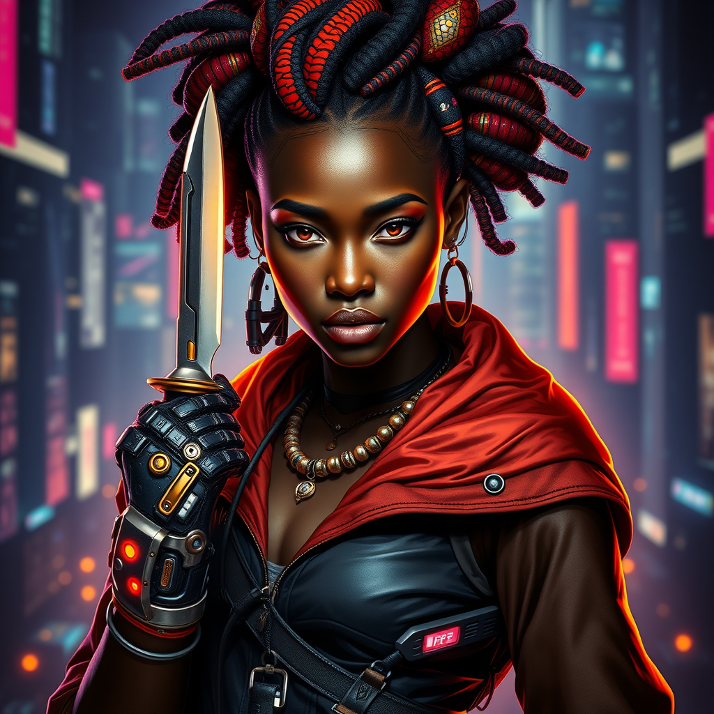 A striking portrait of a powerful African cyberpunk wizard, featuring a young woman with an intricately designed cybernetic arm and a stylish glove holding a sleek, futuristic knife. Her hair is styled in vibrant, intricate patterns, paying homage to traditional African aesthetics blended with cybernetic elements, reminiscent of Afrofuturism. The background showcases a neon-lit cityscape that reflects a fusion of advanced technology and cultural roots. Her attire is a seamless blend of a fashionable cyberpunk mechanoid style and African steampunk influences, adorned with metallic and digital textures. Her gaze is intense and determined, embodying the spirit of a Shadowrun-like character. She stands as a teen black cyborg, exuding a sense of resilience and intelligence akin to an African steampunk alchemist. Her presence echoes the powerful aura of Loba Andrade from Apex Legends, capturing the elegance and prowess of a skilled cyberpunk character. A dynamic blend of cybernetic enhancements and traditional African motifs adorn her, with elements of afro futurism seamlessly integrated into her character design. Her posture and expression exude the charisma of a captivating cyborg merchant woman in a vibrant future world, reminiscent of the iconic allure of Ororo Munroe in a digital age.