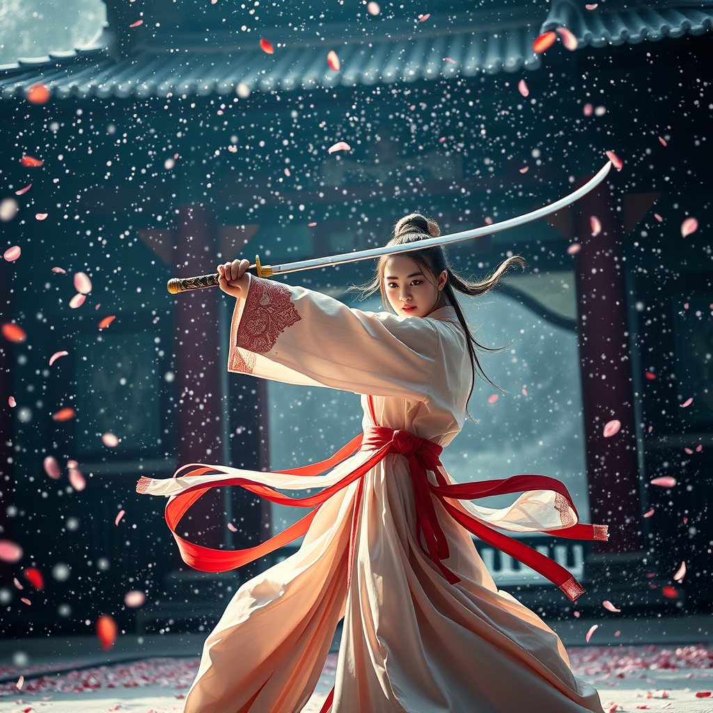 A breathtaking scene unfolds as snowflakes and petals dance in the air, a 16-year-old Chinese girl clad in exquisite Hanfu wields a sword with grace and precision in the heart of an ancient temple. The setting is bathed in cinematic movie light, capturing her dynamic swordfighting in a martial arts style that blends elegance and power. The atmosphere is reminiscent of a Chinese fairy tale, enveloped in a kaleidoscope of colorful lights that illuminate her every movement. The scene is highly detailed and dramatic, showcasing realistic lighting and shadows. This stunning panorama is like a 35mm film shot, bringing to life a vivid and captivating world where beauty meets intensity in perfect harmony.