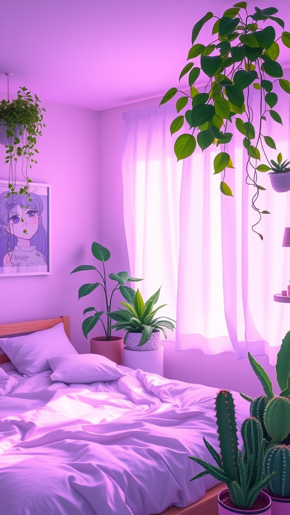 Cozy bedroom bathed in soft lavender light, featuring anime-inspired decor. Lush green plants and adorable cacti create a tranquil atmosphere, while whimsical touches bring a sense of playfulness to the serene night setting.