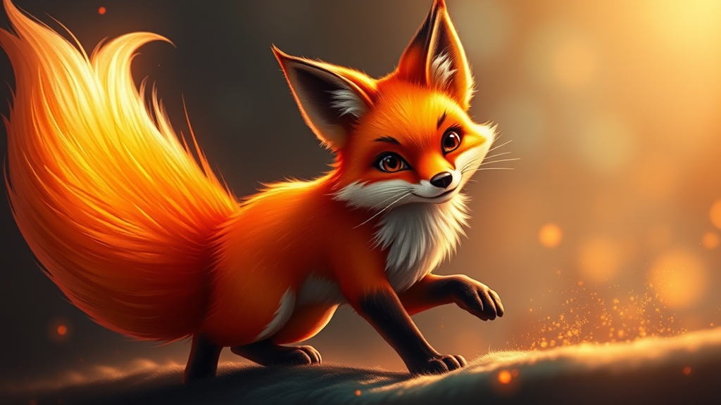 A realistic, animated fox inspired by the Firefox browser logo, featuring vivid russet fur that shimmers with fiery hues. Its eyes are bright and intelligent, reflecting a playful curiosity. The fox's bushy tail swirls around it, reminiscent of a blazing comet, casting warm, golden light. Its agile movements are graceful yet lively, embodying both elegance and a mischievous spirit. The environment around the fox subtly hints at a digital realm, with hints of pixels and data streams glistening in the background, merging the natural essence of the fox with an aura of modern technology.