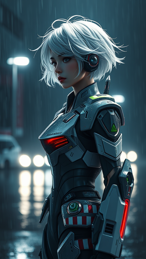A young woman clad in sleek, advanced Gundam armor stands alone on a stormy, rain-soaked night. Her short white hair flows elegantly in the wind, contrasting with the dark ambience that surrounds her. The scene is dramatically illuminated with cinematic flair, capturing the essence of a high-resolution masterpiece trending on ArtStation. The environment around her is both stunning and surreal, bathed in a celestial glow that feels otherworldly. This hyperrealistic 3D render showcases intricate details and vivid colors, the kind of visual depth you'd expect from a production in Unreal Engine 5. The atmosphere is both divine and otherworldly, reminiscent of top-tier anime and manga influences. Despite the storm, the reflection of raindrops on her armor creates a surreal shine, emphasizing the intricate design. The photograph-like quality brings a sense of hyper-realism, capturing every nuance with sharp focus, casting an ethereal glow with its artistic lens flare and perfect cinematic lighting.