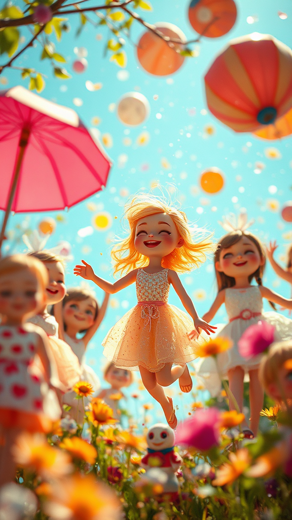 In a captivating display of vibrant creativity, the scene envelops the viewer in a world brimming with joy and boundless energy. The image bursts with life, where each element gleams with its unique charm, drawing the viewer into a whimsical atmosphere filled with laughter and delight. One can almost sense the harmonious sounds of merriment, feel the gentle warmth of sunlight, and the playful breeze that dances through the air. This impressive work of art leaves the viewer feeling invigorated and deeply touched by its enchanting beauty and originality. CGI, 3D, doll-like figures, artistic rendering, subtly distorted, text overlay, partially obscured, low resolution, slight imperfections, surreal anatomy, exaggerated features, abstract elements, dream-like quality.