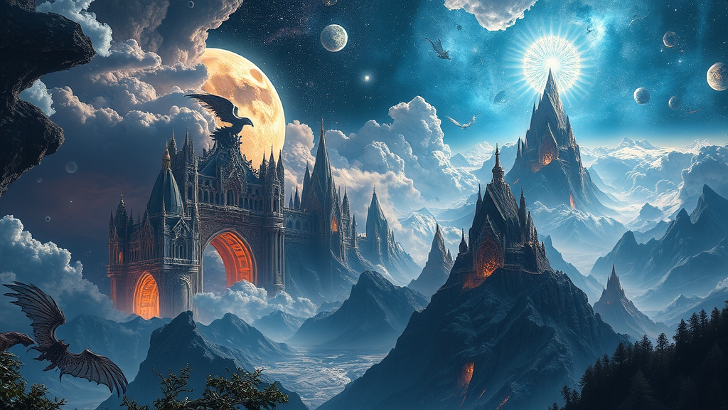 A celestial marvel, a mystical realm within a realm, captured in ultra high definition from the cosmos, unveiling intricate fantasies, depicting five sublime worlds interwoven. Their ethereal beauty and dark allure strike a balance between divine heavens and infernal depths, each landscape teeming with enchanting and elaborate detail.