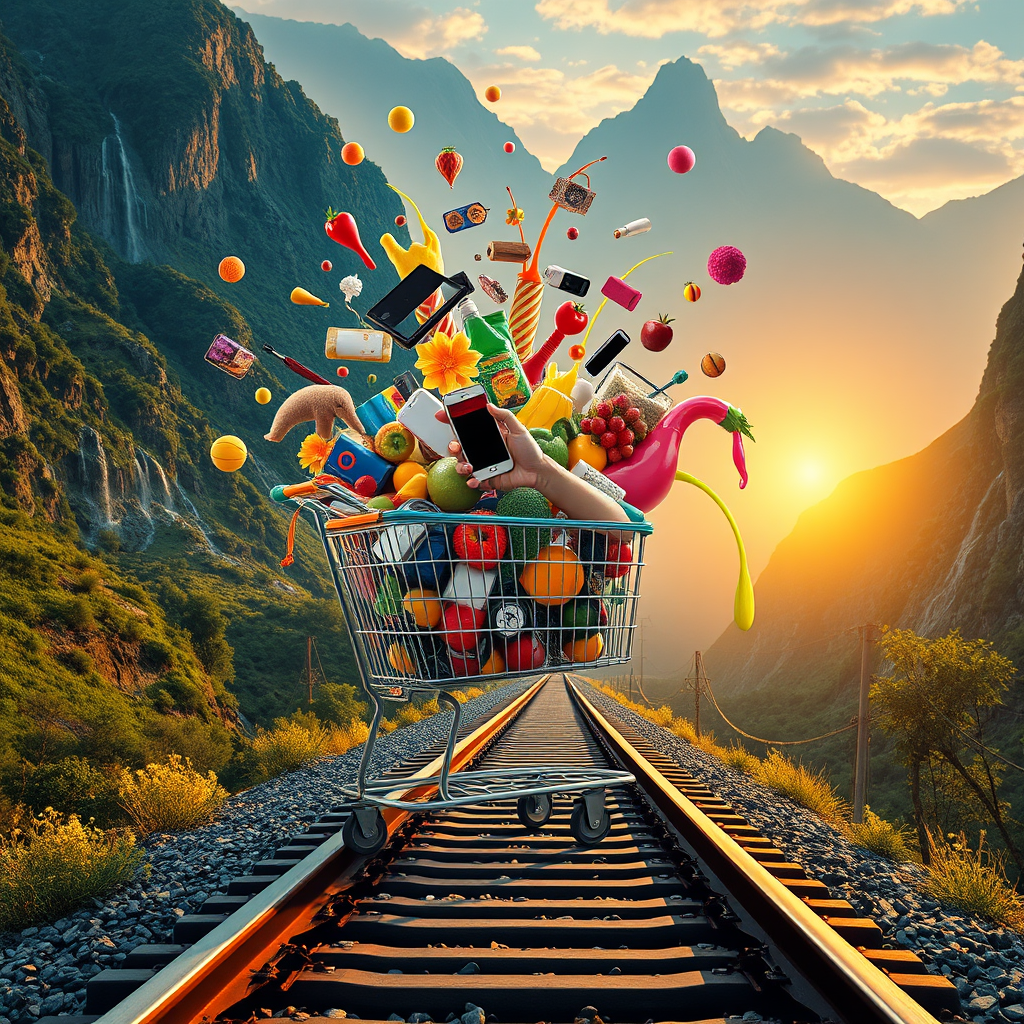 Create a vibrant and surreal image where the scene is set on a dramatic railway track that cuts through a picturesque mountainous landscape with lush greenery and cascading waterfalls. The focal point is a shopping cart, dynamically perched on the rails, overflowing with an explosion of colorful objects symbolizing e-commerce excess. It brims with a kaleidoscope of fresh fruits, vegetables, electronic gadgets, household items, and whimsical splashes of bright, paint-like textures trailing into the sky. The objects' dynamic, upward trajectory enhances the visual drama, while the dense arrangement provides depth with a dizzying array of floating products defying gravity. A warm, golden sunset bathes the scene, casting elongated shadows, adding to the visual drama. The image is hyper-realistic, with meticulous attention to textures and materials reflecting light and shadows convincingly. The atmosphere exudes overwhelming vibrancy and kinetic energy, capturing the fantastical and commercially opulent essence of the scene.