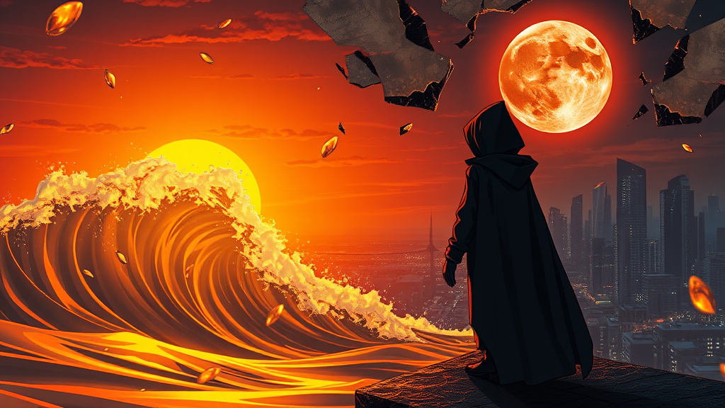 Masterpiece, highest quality, a vibrant golden sea wave illuminated by a brilliant orange sunset, shimmering golden droplets suspended in air, a solitary girl on a ledge overlooking a nighttime cityscape, stylized urban fantasy art, hooded Sith Lord presence, digital cyberpunk anime style, blood moon casting its glow, adorned in a futuristic hooded cape, modern sci-fi anime aesthetic, intense dark cyberpunk vibes, anime girl shrouded in mystery during a blood moon, created with Unreal Engine rendering, surreal peeled sky with fractures and broken winds, reality emerging through sky fissures, hyper-detailed, hyper-realistic materials, dynamic Unreal Engine imagery, intense lighting effects, concept art masterpiece in Unreal 5, compelling visual narrative.