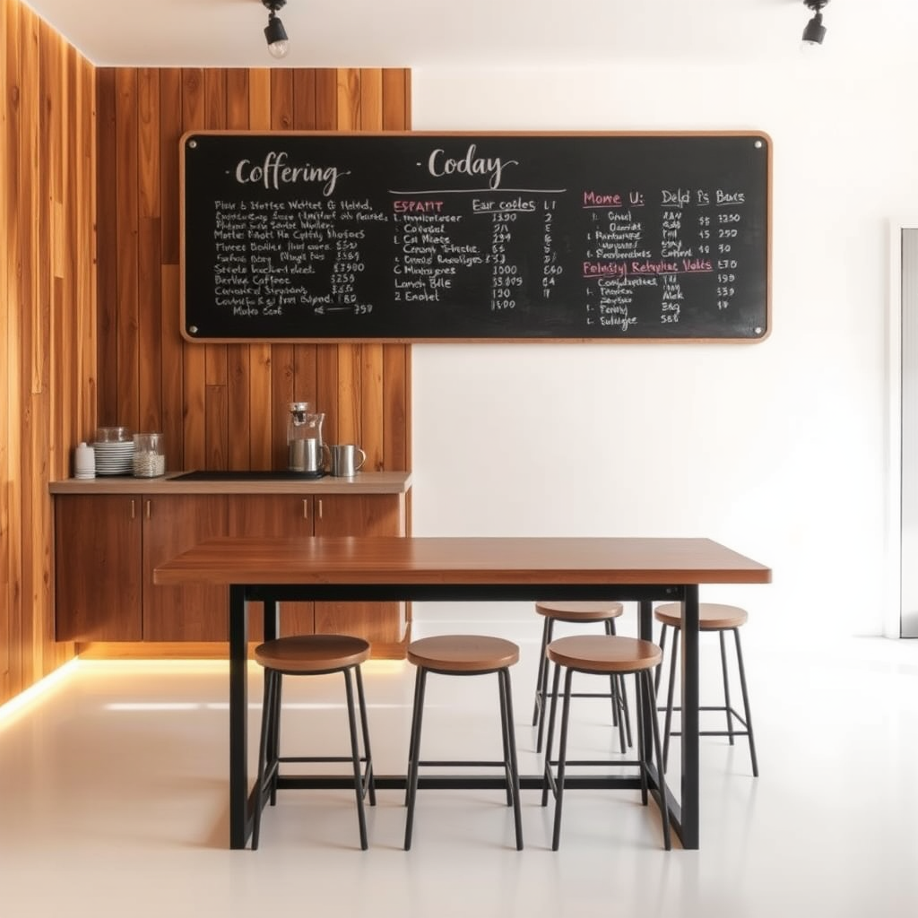 In a cozy coffee shop, the bar table sits prominently along wooden paneled walls, exuding a rustic warmth. The floor, a pristine white, reflects the glow of the ambient lighting, casting a soft illumination throughout the minimalist interior. Above, a large blackboard displays the day's offerings in artful chalk script, adding a touch of artisanal flair. The simplicity of the design invites patrons to relax and savor the inviting atmosphere.