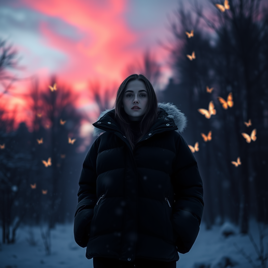 Blurry image of a snowy winter puffer jacket fashion at night, beneath a surreal sky dominated by shifting shades of crimson and cobalt, with realistic butterflies glowing gently amidst a shadowy forest. The scene embodies minimalist beauty and androgyny, with a cold palette of light black hues. It exudes a cosmopolitan energy with serene, ethereal faces, and loose, fluid forms among abstract elements.